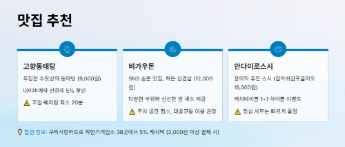 💬 "구리사랑카드 착한가격업소 38곳 5% 캐시백, '찍고! 먹고! 올리고!' 와구리맛집 방문인증 이벤트로 추첨 200명 상품권 1만원까지 받을 수 있어요!"