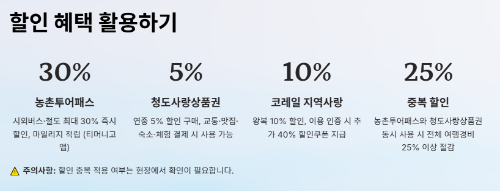 농촌투어패스(티머니고 앱)를 활용하면 시외버스와 철도에서 최대 30% 즉시 할인받을 수 있어요. 마일리지도 적립되니까 다음 여행에도 도움이 돼요!