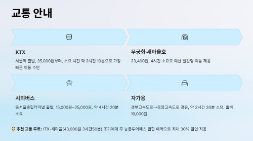 무궁화호나 새마을호는 23,400원으로 더욱 경제적이에요. 4시간 정도 걸리지만 창밖 풍경을 감상하며 여유로운 여행을 즐기고 싶다면 추천해요!