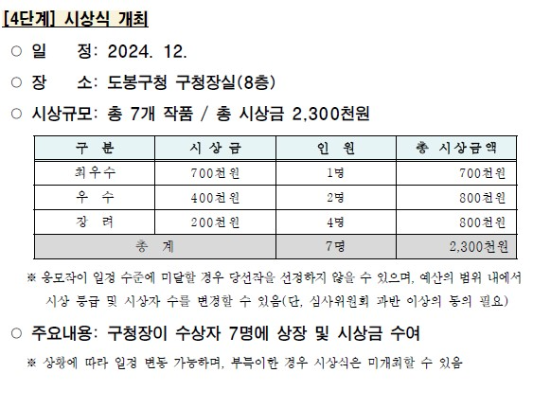 2024년 12월, 도봉구청에서 개최될 예정인 4단계 시상식에 대한 안내를 드리고자 합니다. 이번 시상식은 도봉구청 8층 구청장실에서 진행될 예정이며, 총 7개의 우수 작품이 선정되어 시상될 계획입니다. 시상식에서는 구청장이 직접 시상자들에게 상장과 상금을 수여하게 되며, 시상 규모는 총 2,300천 원에 달합니다.
