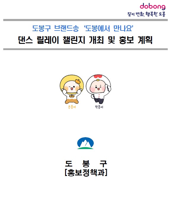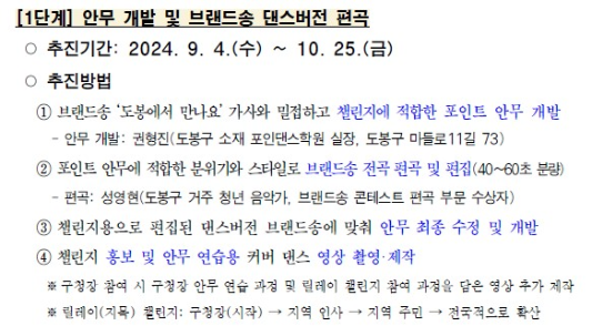 현재 '도봉에서 만나요'라는 가사를 중심으로 한 브랜드송에 맞추어 안무 개발과 음악 편곡 작업을 진행하였으며, 현재 안무와 음악 제작이 완성되었습니다. 이번 프로젝트의 첫 번째 단계는 2024년 9월 4일부터 10월 25일까지 진행될 것이며, 포인트 안무 개발은 도봉구의 권형진 실장이 맡아 지역의 특징을 살린 포인트 안무로 완성되었습니다. 이와 함께, 브랜드송의 전국적 확산을 위해 송영석 편곡가가 도봉구 주민들이 쉽게 따라할 수 있는 음악으로 편곡을 완료했습니다.