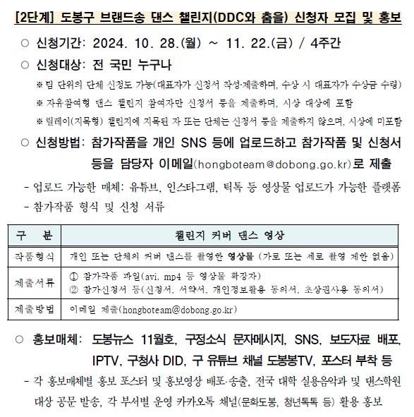 이번 챌린지를 통해 도봉구의 브랜드송을 더욱 많은 사람들에게 알리고, 함께 즐길 수 있는 시간을 만들어가고자 합니다. 결과 발표와 시상식은 12월에 진행될 예정입니다.