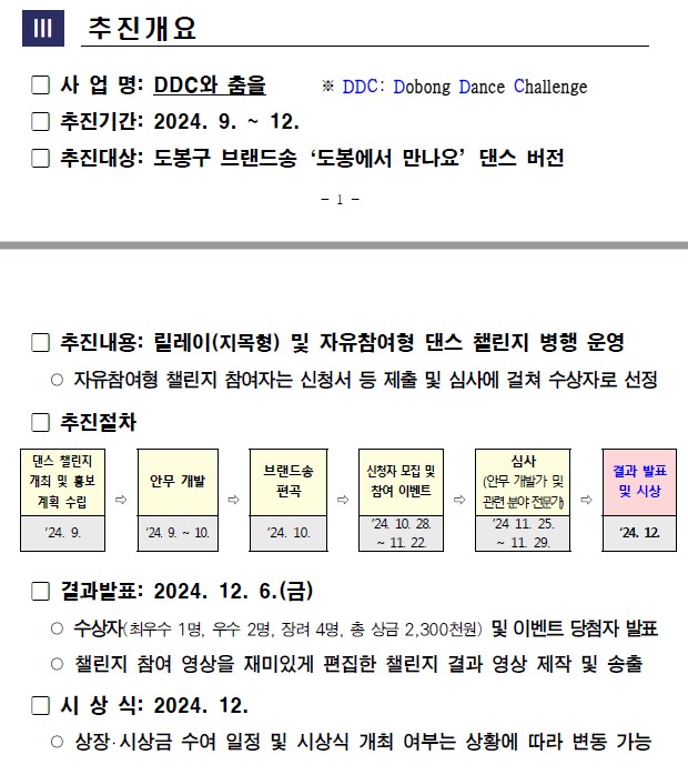 이번 "DDC와 춤을" 댄스 릴레이 챌린지는 도봉구의 브랜드송 "도봉에서 만나요"를 중심으로, 지역사회와 국민 모두가 함께 즐길 수 있는 특별한 기회입니다. 도전 정신이 넘치는 모든 분들이 자신만의 개성과 창의성을 발휘할 수 있는 이 챌린지를 통해, 도봉구의 브랜드송이 전국적으로 확산될 것으로 기대됩니다. 신청 절차와 전문가 평가 과정을 거쳐 선정된 우수작들은 12월에 개최될 시상식에서 그 영예를 안게 될 것입니다. 이번 챌린지에 많은 참여와 관심을 부탁드리며, 모든 참가자들이 자신의 열정을 마음껏 펼칠 수 있기를 바랍니다.