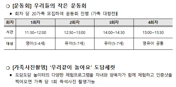 [운동회] 우리들의 작은 운동회는 가족 단위로 참여하는 운동회 프로그램으로, 각 회차마다 20가족이 모집되어 진행됩니다. 프로그램은 총 4회차로 나뉘며, 각 회차의 대상 연령대와 시간이 다르게 구성되어 있습니다. 참가 가족들은 자녀의 연령에 맞는 회차를 선택하여 참여할 수 있으며, 운동회 형식으로 가족 간 대항전이 펼쳐집니다.