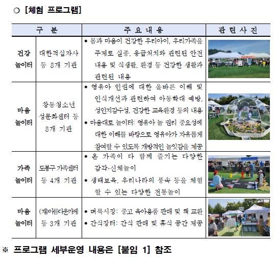 행사장에서는 영유아의 놀이 권리를 강조하는 다양한 놀이 프로그램들이 운영되며, 이를 통해 놀이의 중요성을 인식하고 놀이를 통한 아이들의 권리 보호와 발달을 지원하고자 합니다. 축제는 지역사회의 참여를 독려하며, 건강한 육아 문화를 지역사회와 함께 만들어가는 장이 될 것입니다.