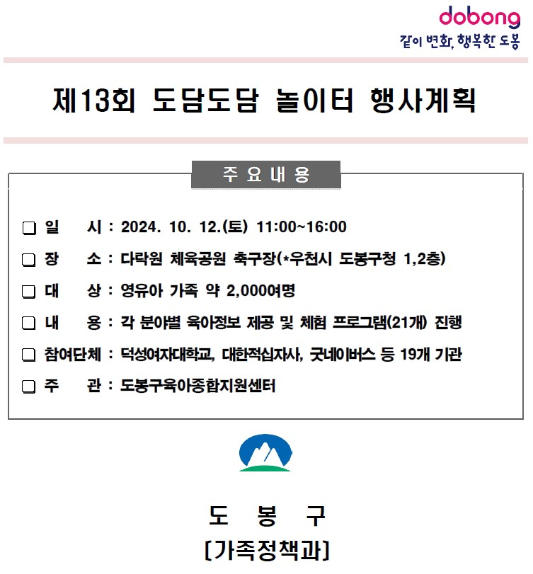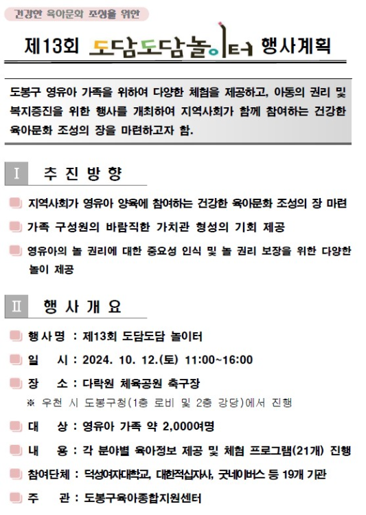 제13회 도담도담 놀이터 축제는 도봉구 육아종합지원센터 주관으로 진행되며, 영유아와 그 가족들을 위한 다양한 놀이와 교육 프로그램을 통해 건강한 육아 문화를 형성하고, 놀이를 통한 아이들의 권리 보호와 발달을 지원하는 것을 목표로 하고 있습니다. 부모와 아이들이 함께 체험하며 유대감을 쌓고, 지역사회 내에서 건강한 육아 문화와 공동체 의식을 강화하는 소통의 장이 될 예정입니다. 또한, 다양한 전문가와 기관들이 참여하여 부모들에게 유익한 육아 정보를 제공하며, 가족들이 함께 즐길 수 있는 다양한 프로그램을 마련해 가족 간의 소통과 유대감을 증진시킬 수 있을 것으로 기대됩니다.
