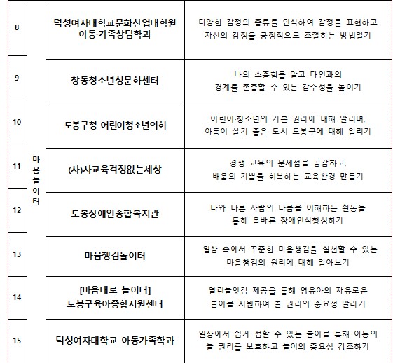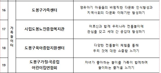 마지막으로 도봉구가정·공공립 어린이집연합회는 자녀가 좋아하는 놀이를 가족과 함께 즐기며, 놀이를 통한 가족 간의 즐거움을 극대화하는 활동을 제공합니다. 이 프로그램은 자녀와 부모가 함께하는 놀이를 통해 상호작용하고, 더 깊은 유대감을 형성할 수 있는 기회를 제공합니다. 자녀의 관심사에 맞춘 놀이를 통해 부모는 자녀를 더 깊이 이해하고, 자녀는 부모와의 친밀한 관계를 형성할 수 있습니다.