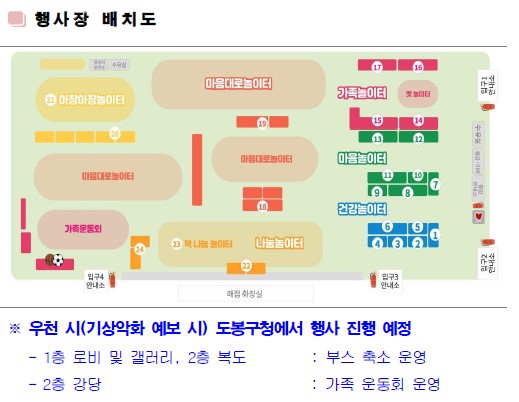 우천 시에는 도봉구청 내 1층 로비와 갤러리, 2층 북도 및 강당에서 행사가 진행될 예정입니다.