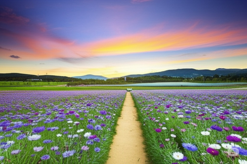 맑은 날에는 꽃과 하늘이 어우러져 몽환적인 분위기를 자아내며, 일몰 무렵에는 더욱 특별한 색채를 만나볼 수 있습니다. 꽃밭 한가운데 조성된 노란색 문 포토존은 "도깨비" 드라마 촬영지로 알려져 있어 많은 방문객이 찾는 포토 스폿입니다.