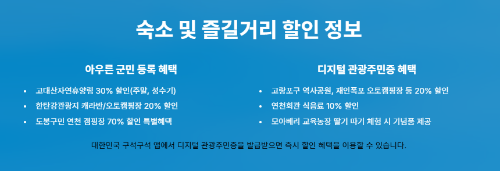 아우른 군민 등록과 디지털 관광주민증을 활용하면 최대 70%까지 숙박비 절약이 가능해요! 연천 아우른 군민 등록 시 고대산자연휴양림 30% 할인과 한탄강관광지 캐라반/오토캠핑장 20% 할인 혜택을 받을 수 있습니다.