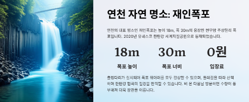 연천의 대표 명소인 재인폭포는 높이 18m, 폭 30m의 웅장한 현무암 주상절리 폭포예요! 2020년 유네스코 한탄강 세계지질공원으로 등재되었으며, 입장료 무료에 10:00-17:30(동절기 16:00)까지 개방됩니다.