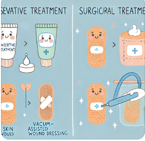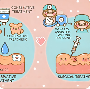 - 보존적 치료 🌿: 1단계와 2단계 욕창에는 외용제와 창상피복제를 사용하여 상처의 악화를 방지합니다. 최근에는 진공 폐쇄 드레싱(VAC)을 사용하여 상처 부위의 삼출물을 흡입하면서 새로운 조직 생성을 돕는 방법도 있습니다.