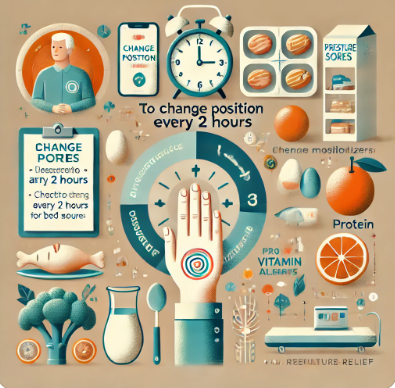 - 영양 관리 🥦: 단백질과 비타민 C가 풍부한 음식을 챙겨 먹습니다. 영양 관리는 피부와 근육의 회복을 돕기 때문에 욕창 예방에 중요한 역할을 합니다. 단백질과 비타민c가 많은 음식 - 닭고기, 소고기, 생선(연어, 참치), 계란 🥚, 콩류(렌틸콩, 병아리콩), 두부 🥘, 유제품(우유, 요거트, 치즈 🧀) 과일(오렌지, 딸기, 키위, 레몬 🍊🍓), 채소(브로콜리, 파프리카, 시금치 🥦🥬), 감자 🥔