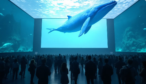 범고래, 해파리, 가오리들이 헤엄치는 바닷속 풍경과 마지막에 등장하는 거대한 핑크 고래가 압도적인 몰입감을 선사해요. 완전 무료로 관람할 수 있어서 모든 방문객이 즐길 수 있답니다!