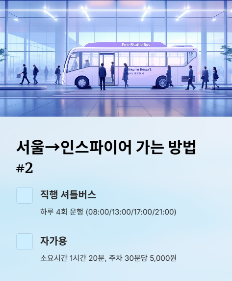 공항철도 + 무료셔틀버스는 가장 경제적이면서도 환승이 간편한 대중교통 수단이에요. 1,900원으로 인스파이어까지 갈 수 있어서 정말 알뜰하죠!