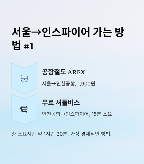 서울에서 인스파이어로 가는 가장 경제적이고 편리한 방법은 공항철도 AREX를 이용해 인천공항에 도착한 후 무료 셔틀버스를 이용하는 것이에요. 전체 소요시간은 약 1시간 30분으로, AREX 요금 1,900원만 지불하면 된답니다!