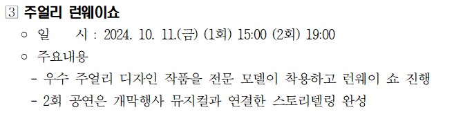 2024년 10월 11일 금요일에 두 차례의 주얼리 런웨이 쇼가 예정되어 있습니다. 첫 번째 쇼는 오후 3시에, 두 번째 쇼는 오후 7시에 열리며, 각기 다른 시간대에 시민들에게 특별한 경험을 선사할 예정입니다.