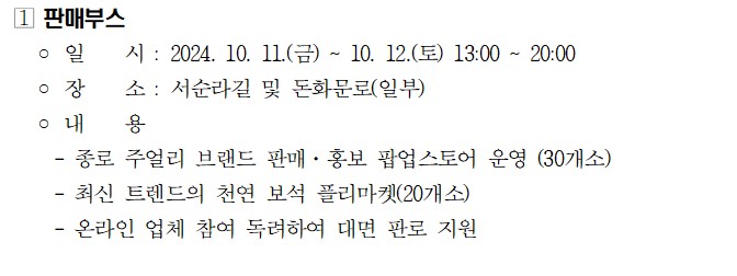 관람객들이 주얼리를 직접 구매할 수 있는 판매부스와 할인 판매 행사가 준비되어 있습니다. 이 행사들은 10월 11일 금요일부터 10월 12일 토요일까지 오후 1시부터 8시까지 서순라길과 돈화문로 일대에서 진행됩니다.