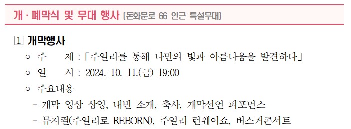 개막식 주요 내용으로는 개막 영상 상영과 함께 내빈 소개, 축사, 개막 선언 퍼포먼스가 포함됩니다. 이후, '주얼리로 REBORN'이라는 뮤지컬 공연이 펼쳐지며, 이어서 주얼리 런웨이쇼와 버스커 콘서트(k-pop)가 열려 시민들에게 특별한 볼거리와 즐거움을 제공합니다. 이 개막 행사는 주얼리와 공연이 어우러진 축제의 시작을 알리며, 종로의 주얼리 거리가 활기차게 다시 태어나는 순간을 기념하게 될 것입니다.