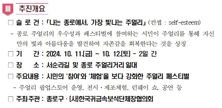행사는 2024년 10월 11일 금요일부터 10월 12일 토요일까지 이틀 동안 진행되며, 서울 종로구의 서순라길 및 종로 주얼리 거리 일대에서 열립니다. 주요 프로그램으로는 시민들의 참여와 체험을 강조한 다양한 행사들이 포함되어 있습니다. 주얼리 팝업스토어에서는 최신 트렌드의 주얼리를 만나볼 수 있으며, 전시와 주얼리 제조 체험을 통해 시민들이 직접 주얼리 제작 과정을 경험할 수 있습니다. 또한, 주얼리 런웨이 쇼와 공연이 마련되어 있어 다양한 볼거리를 제공합니다.